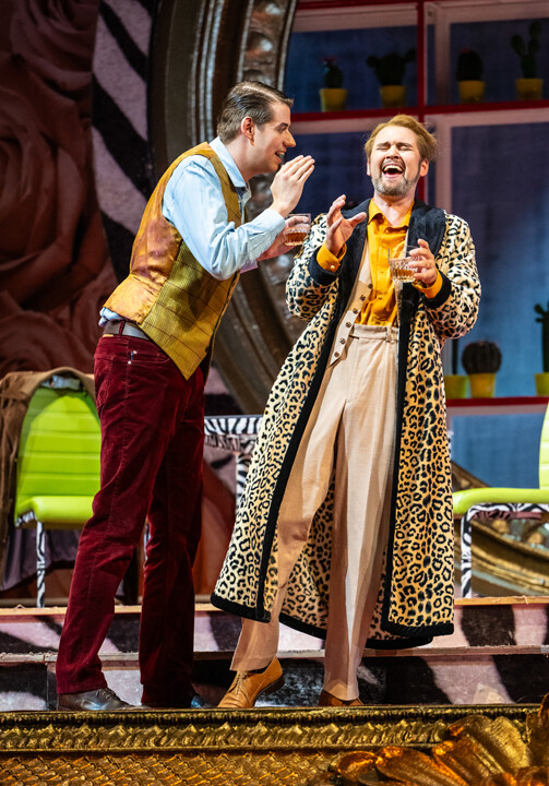 Prince Orlofsky’s party is the scene of exuberant celebration. Everything is just as Falke had imagined. Adele appears in her “madame’s” evening gown and claims to be a young artist named Olga. Falke introduces Eisenstein to the company as Marquis Renard and the Prison Director also turns up under the pseudonym Chevalier Chargrin. Finally a masked Hungarian Countess is announced – who is none other than Rosalinde. Eisenstein does not suspect who he has in front of him and attempts to lure this unknown beauty with a pocket watch. Rosalinde succeeds in taking this exquisite piece of evidence from him. Fuelled by champagne, Eisenstein tells of how once after a carnival ball he publicly embarrassed the drunken Falke in a bat costume. The night accelerates in a giddying whirl to a state of collective fraternization until it ends abruptly when the clock strikes six a.m.