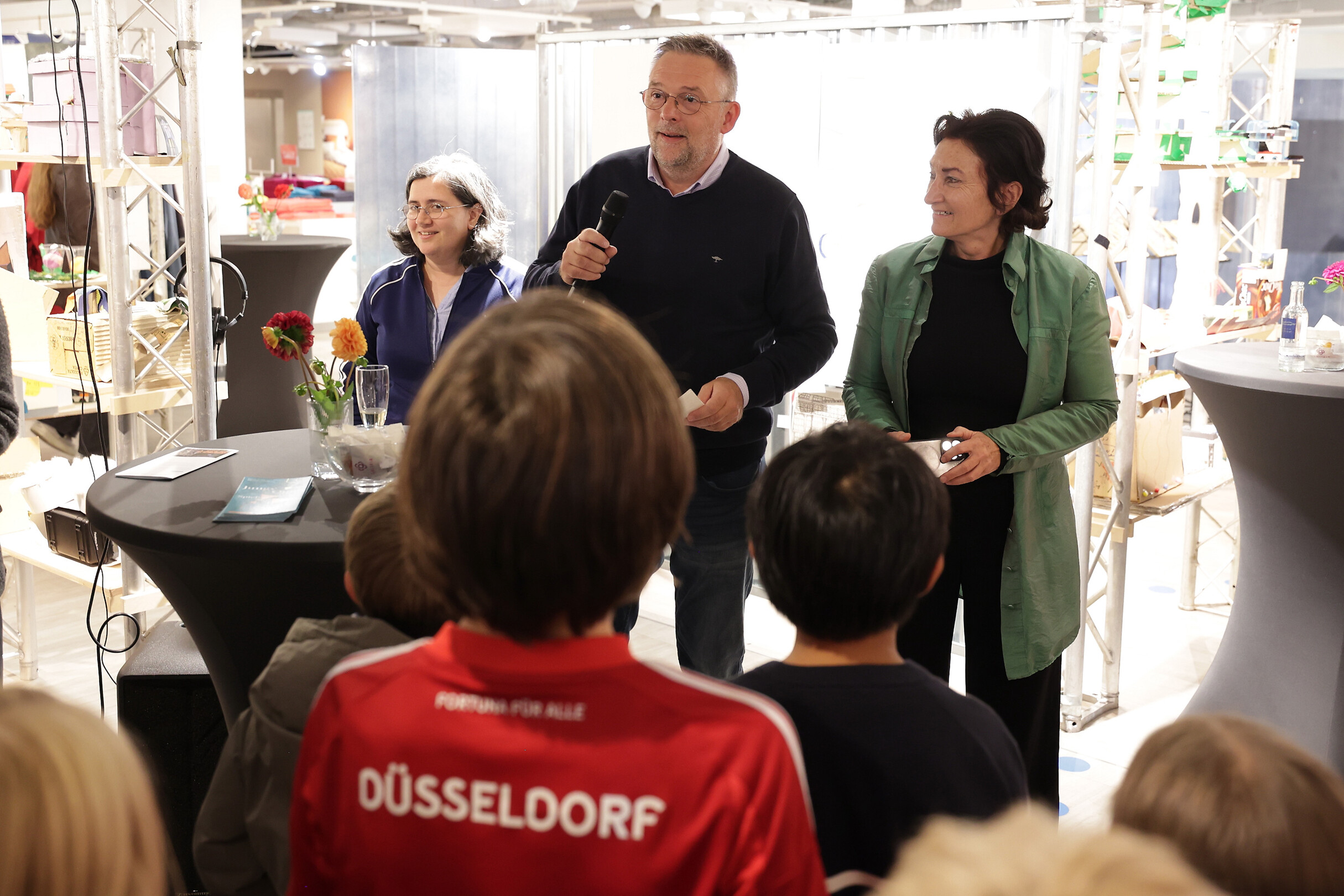 Ausstellung Kinderarchitekturwettbewerb Opernhaus der Zukunft Michaela Dicu (Leiterin Junge Oper), Jens Breder (Direktor Kommunikation, Marketing & Sales Deutsche Oper am Rhein) und Miriam Koch (Beigeordnete für Integration und Kultur der Landeshauptstadt Düsseldorf) bei der Eröffnung der Ausstellung. Foto: Landeshauptstadt Düsseldorf/David Young