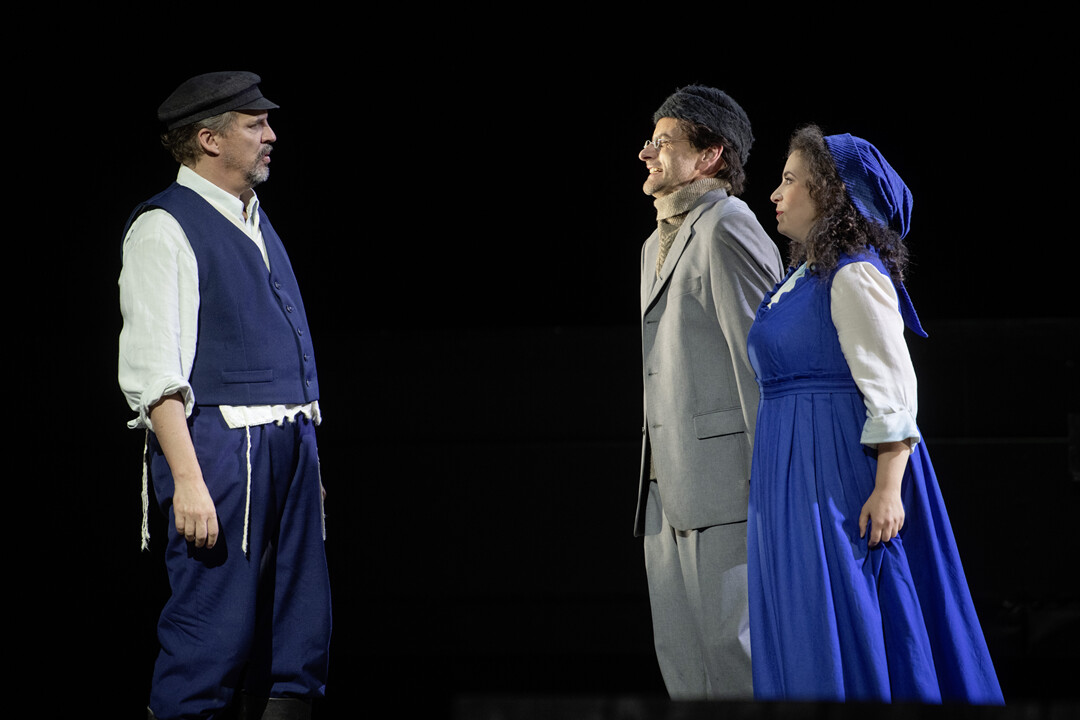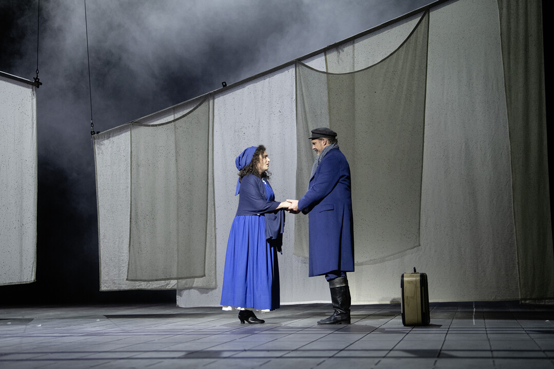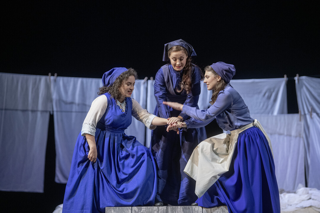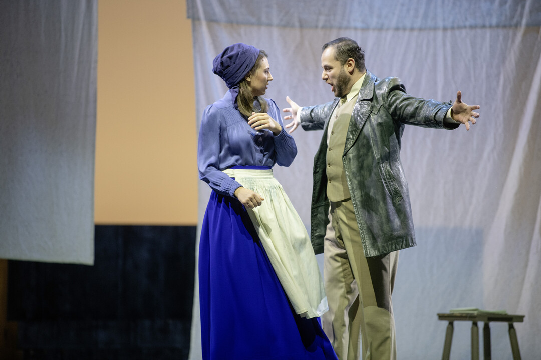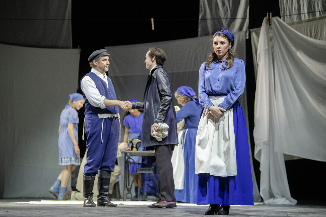 Als erstes fällt mir das reduzierte Bühnenbild von Nikolaus Webern ins Auge, bestehend aus vom Seilboden herabhängenden weißen Tüchern, und die stimmungsvolle Beleuchtung. Die Duisburger Philharmoniker, unter der Leitung von Katharina Müllner, sind wie immer virtuos und auf den Punkt. Der Schauspieler Andreas Bittl gibt einen gewitzten, charismatischen Tevje, der exemplarisch für die große Spielfreude des gesamten Ensembles steht.