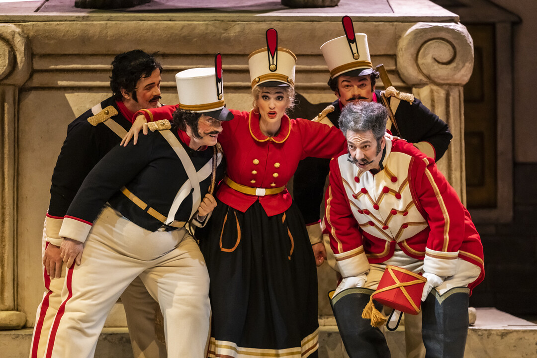 Das Findelkind Marie erobert in Gaetano Donizettis Opéra comique „La Fille du régiment“ alle Herzen im Sturm: Als Marketenderin ist sie der Liebling des gesamten 21. Regiments und ganz besonders des jungen Tirolers Tonio, dem sie ihr Herz versprochen hat. Als die Marquise von Berkenfield in der jungen Frau ihre Tochter erkennt, hat sie jedoch andere Pläne – eine standesgemäße Heirat. Doch Marie und Tonio können einander nicht vergessen. Er offenbart der adeligen Gesellschaft Maries „Vergangenheit“ und erobert so seine Soldatenbraut zurück.