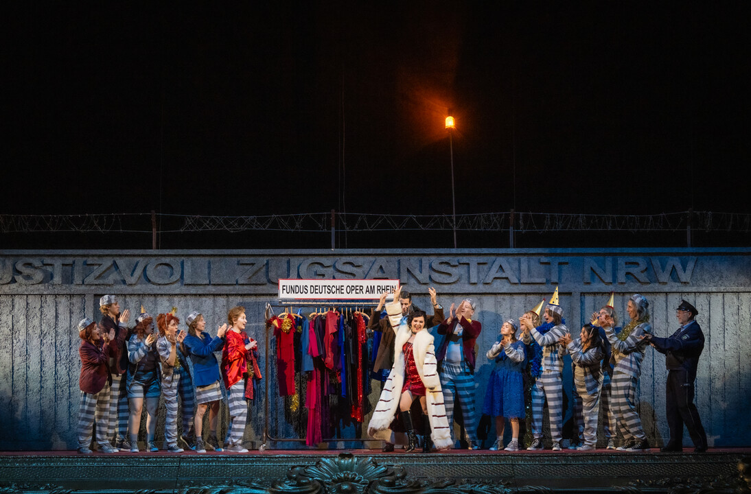 Die Festgesellschaft findet sich nach und nach im städtischen Gefängnis ein. Direktor Frank will seinen ersten Arbeitstag beginnen, Adele sucht nach dem Förderer, der ihr am Vorabend eine Ausbildung versprochen hat, und Eisenstein muss feststellen, dass er bereits inhaftiert ist. Er fühlt sich von Rosalinde betrogen. Sie hält ihm daraufhin seine Uhr unter die Nase und fordert die Scheidung. Falke erscheint mit allen übrigen Festgästen und rettet die Situation. Eisenstein begreift, dass er ein Teil von Falkes Racheplan war. Er versöhnt sich mit Rosalinde und alle sind sich einig, dass der allein Schuldige der Champagner war.
