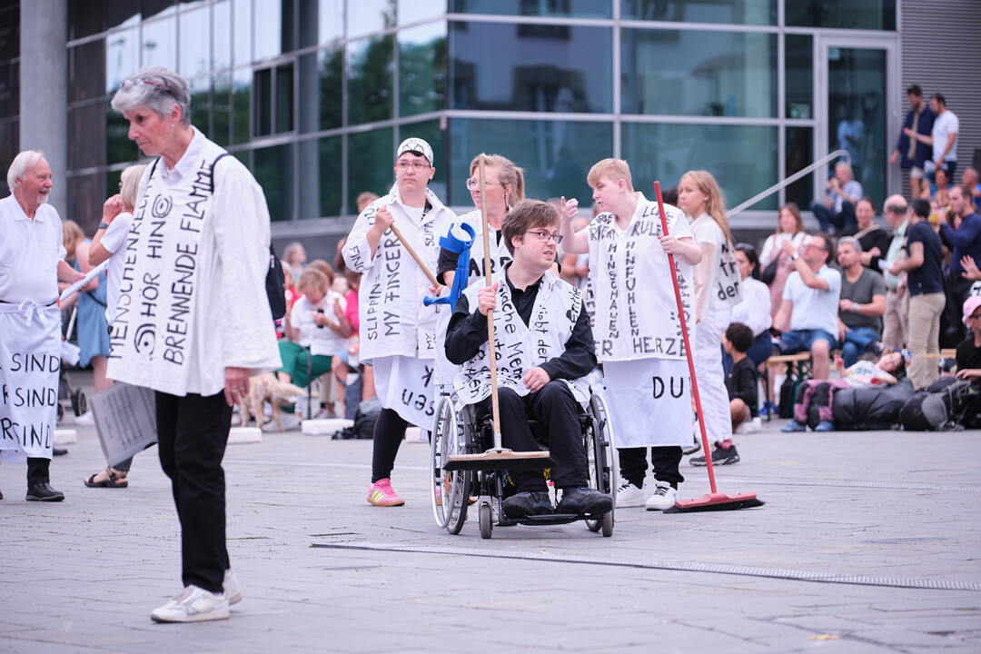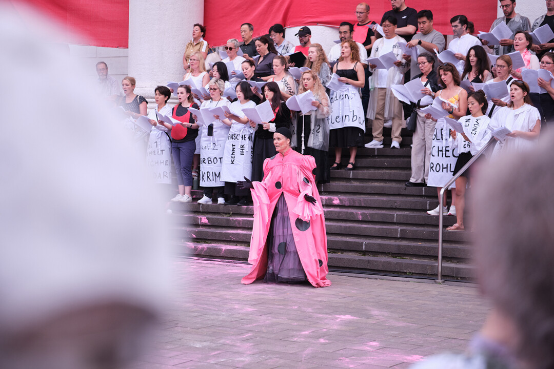 Unter dem Titel „Der Menschheit Stimme“ – ein Zitat aus Beethovens Freiheits-Oper „Fidelio“ – versammeln sich am 20. September um 17 Uhr Hunderte singende Bürger*innen der Stadtgesellschaft Duisburgs auf dem Platz vor dem Theater, um gemeinsam mit einem Ensemble aus Sänger*innen, Schauspieler*innen, Tänzer*innen und natürlich dem Publikum den „Riesen der Menschenrechte“, der unter dem Opernplatz/ König Heinrich-Platz schläft, „zu wecken“ und auszugraben – mit Musik, Text, Ton, Bewegung, Gefühl, Gemeinschaft und der Komposition des Komponisten Amir Shpilmann für einen 300-köpfigen Chor, der auch alle Zuschauer*innen einlädt, mitzusingen.